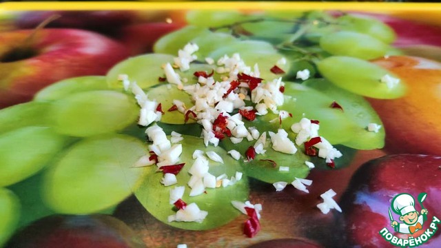 Чистим и мельчим чеснок и перчинку чили вместе с семечками, размалываем горошины смеси перцев