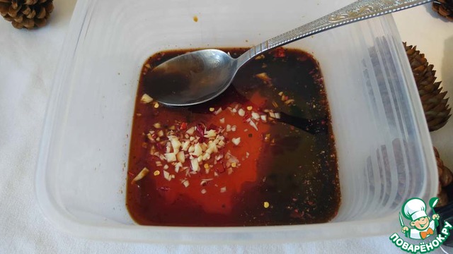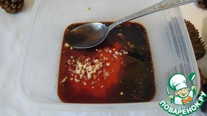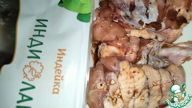 Заливаем индюшатину соусом, перец с чесноком из смеси распределяем на поверхности крылышек, и ждем около получаса, периодически переворачивая кусочки. Пропитавшееся мясо заметно темнеет