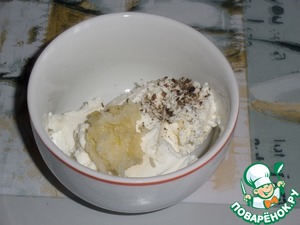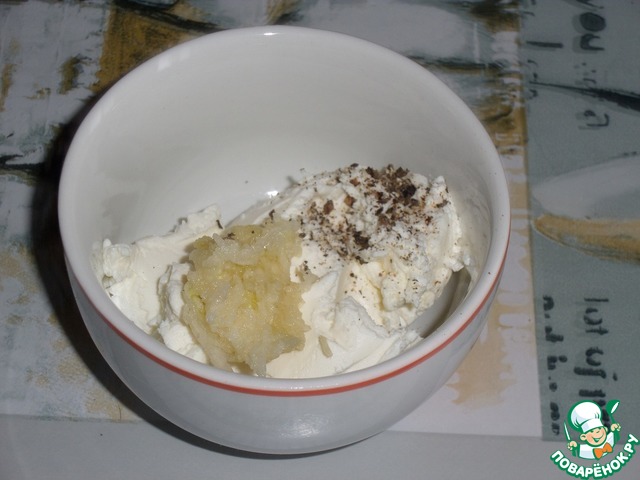 В миску выкладываем творожный сыр. Сюда же трем на мелкой терке чеснок. Добавляем по вкусу перец черный молотый.