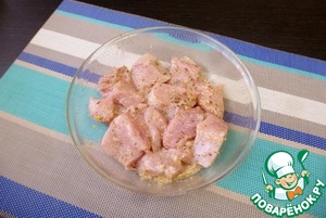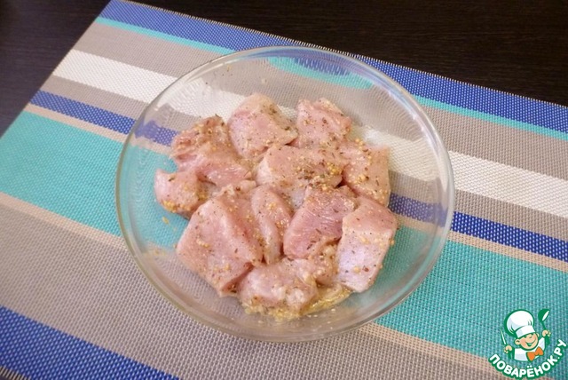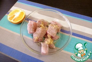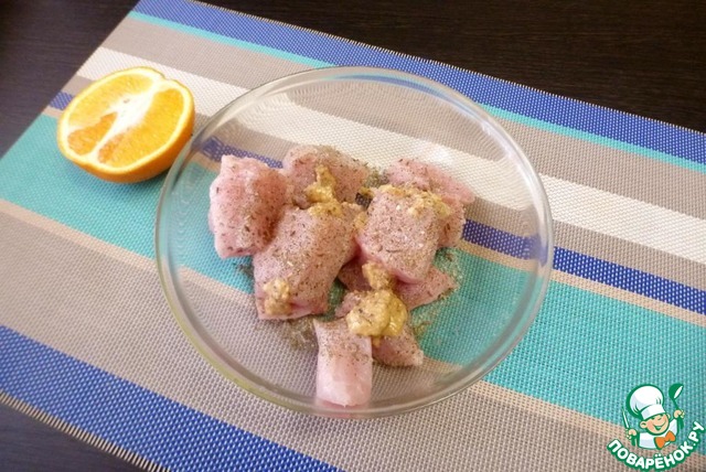 Филе грудки индейки ТМ ИНДИЛАЙТ нарезать крупными кусочками. Посыпать специями, добавить горчицу. Выжать сок из половины небольшого апельсина.