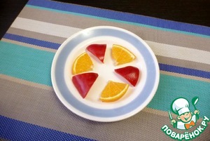 Нарезать вторую половину апельсина на сегменты. Сладкий перец почистить и нарезать на треугольники.