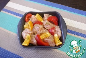 В форму для запекания выложить кусочки индейки, между кусочками мяса распределить апельсин, сладкий перец и веточки тимьяна.