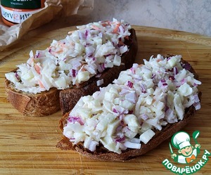 Хлеб нужно отрезать толстым ломтем. Слегка подсушить на сковороде