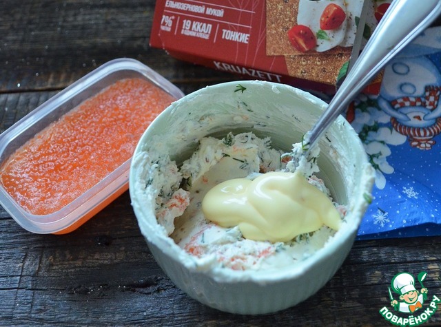 Для более эластичной консистенции добавить майонез, вновь смешать.
