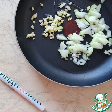 Лук и чеснок мелко порезать и обжарить на сковороде с маслом пару минут