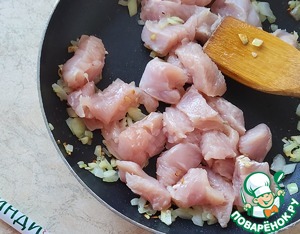 Индейку порезать немелкими кусочками и добавить в сковороду. Обжарить, до побеления большей части кусочков.
