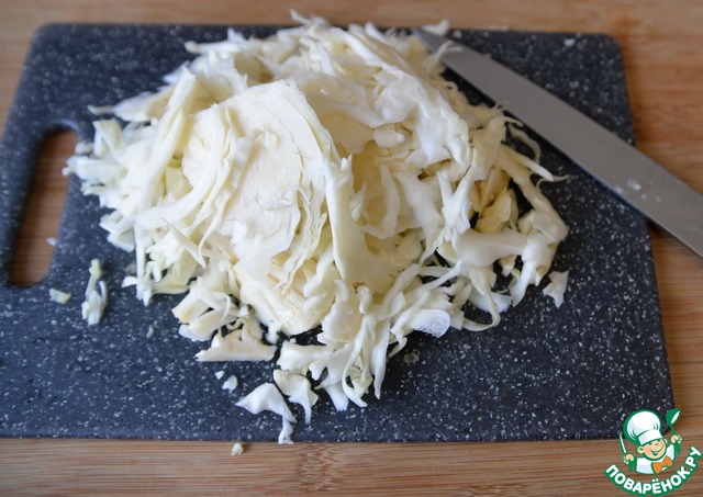 Тонко шинкуем капусту.