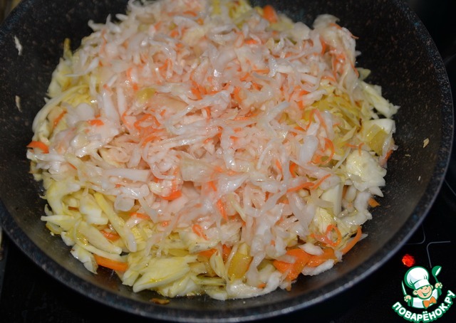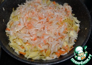 Обжариваем капусту с луком и морковью 5 минут, добавляем квашеную капусту.