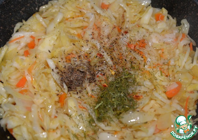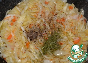 Перемешиваем и тушим 20 минут на среднем огне, периодически помешивая. Добавляем соль, семена укропа, смесь перцев, перец чили, сухую или свежую зелень, у меня - сухой укроп. Ориентируйтесь на кислоту вашей капусты, можете добавить 1 ч. л. сахара. Перемешиваем.
