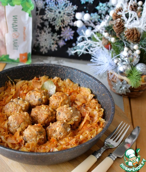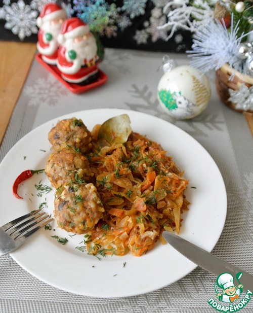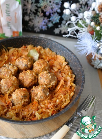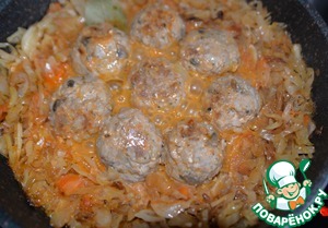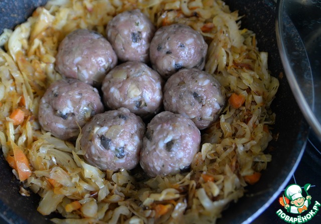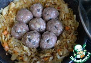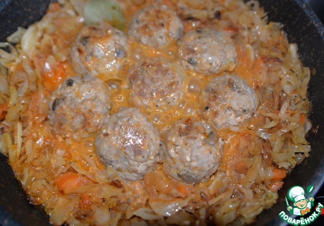 Жареную капусту раздвигаем в стороны, посредине кладём тефтели. Даём им немного поджариться пару минут, переворачиваем.