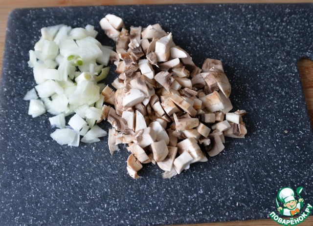Грибы и лук моем, чистим, обсушиваем. Режем мелкими кубиками.