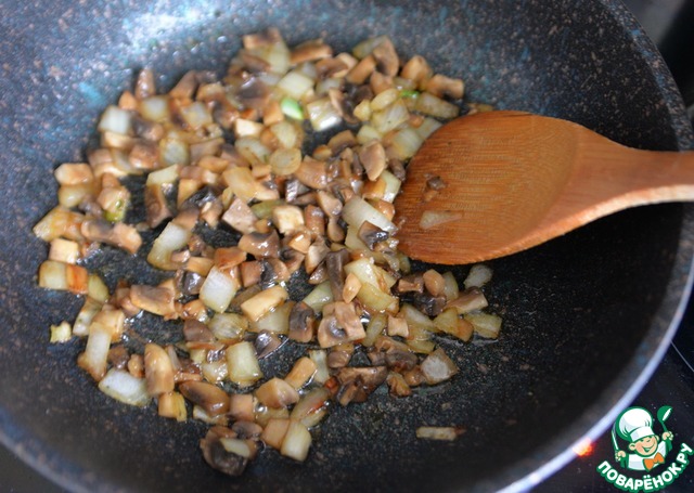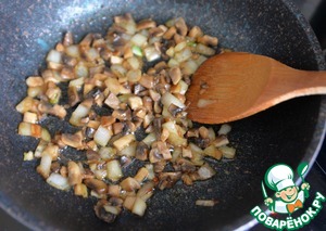 На растительном масле обжариваем пару минут лук, далее кладём шампиньоны, обжариваем около 10 минут на среднем огне до подрумянивания.
