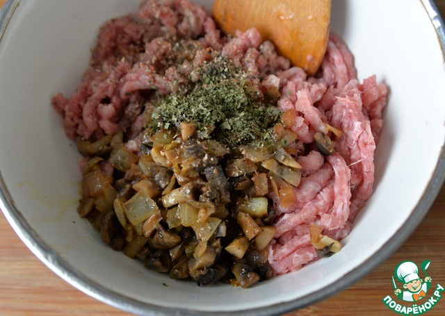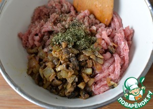 Даём грибам немного остыть, кладём в фарш, добавляем зелень (у меня - сушёная петрушка), соль, смесь перцев. Перемешиваем.