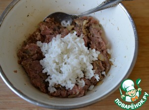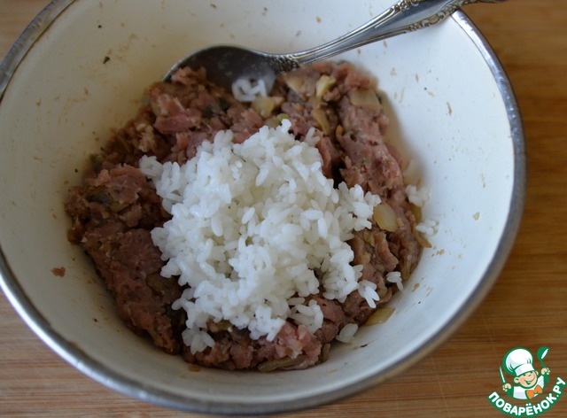 Заранее отвариваем рис, даём ему остыть, добавляем в фарш. Перемешиваем.