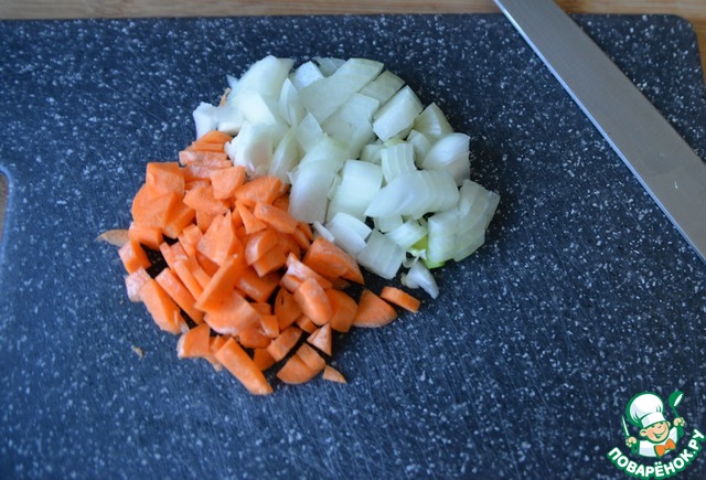 Далее чистим лук и морковь, режем кубиками. Можете морковь натереть.