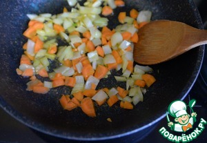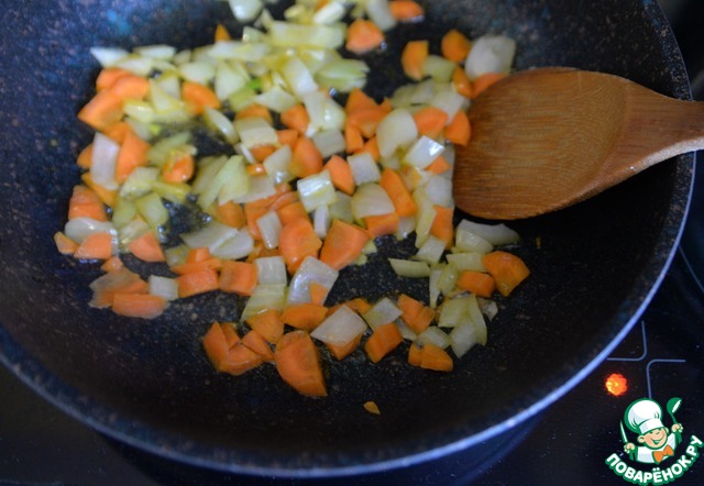 Обжариваем лук и морковь на растительном масле пару минут на среднем огне. Кстати, на этом этапе можете добавить и поджарить шампиньоны, а не класть их в фарш. Это уже на ваш вкус.
