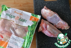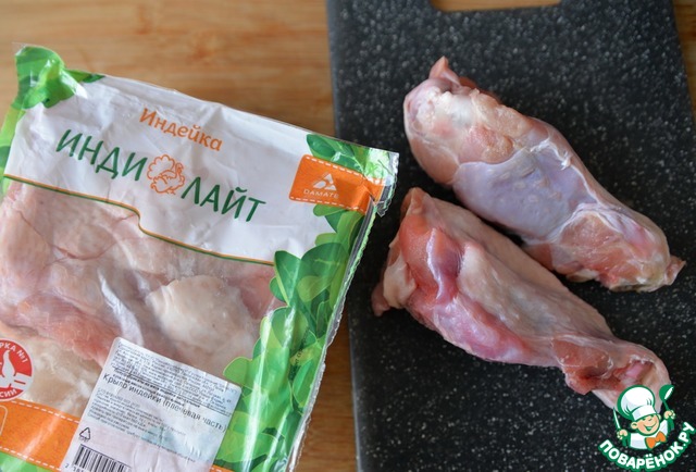 Берём любую часть индейки по наличию. Можно, конечно, брать филе, но я выбрала крыло индейки (плечевую часть) "Индилайт". Индейку моем, заливаем водой, солим, доводим до кипения, варим около 40 минут на среднем огне. Даём остыть.