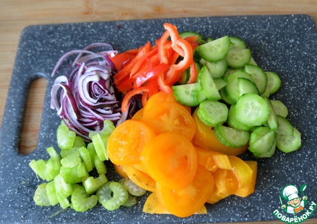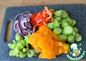 Овощи моем, чистим. Лук режем тонкими полукольцами или стрелками, болгарский перец и сельдерей полосками, помидор и огурец кружками. Я взяла жёлтый помидор для яркости.