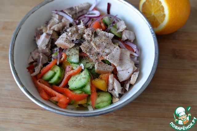 Для заправки смешиваем оливковое масло, сок апельсина, яблочный уксус. Добавляем в салат соль, смесь перцев, заправку. Аккуратно перемешиваем.