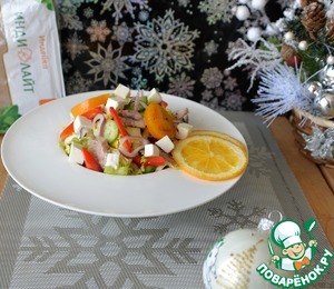 Творожный сыр режем кубиками. У меня сыр для салата, можно брать фету или фетаксу. Кладём кубики сыра сверху салата. Украшаем кружками апельсина. Подаём. Приятного аппетита!