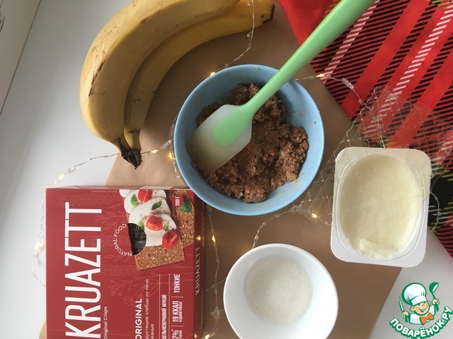 Хлебцы ТМ "KRUAZETT" измельчить в крошку в чаше блендера (или в ступке). Спелый банан измельчить блендером в пюре (если нет блендера, можно с помощью вилки). Смешать крошку из хлебцев с получившимся из банана пюре. Регулируйте консистенцию, постепенно подсыпая крошку (примерно как пластилин должна выглядеть получившаяся смесь)