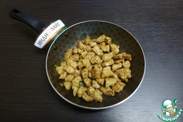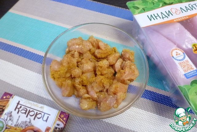 Филе индейки нарезать небольшими кусочками. Посолить, посыпать карри или своей любимой приправой. Оставить на 20 минут.