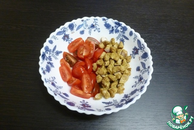 Нарезать помидоры на четыре части. Добавить к ним остывшие кусочки индейки. Если кусочки большие, то их лучше разрезать пополам.