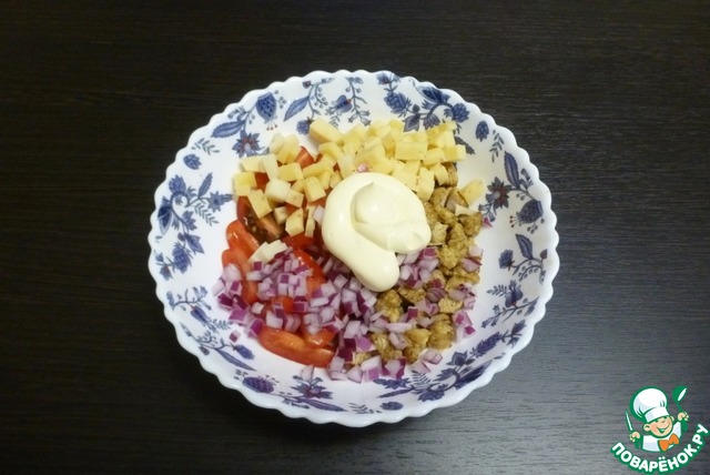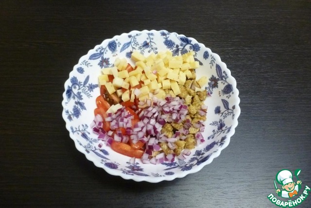 Добавить нарезанный мелким кубиком сыр и маринованный лук.