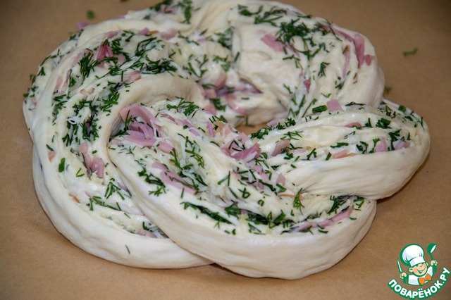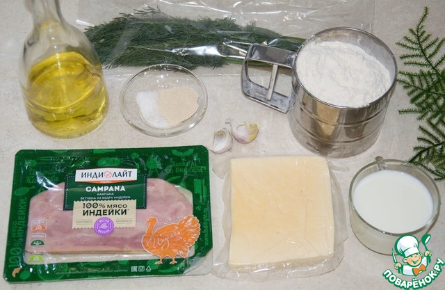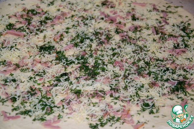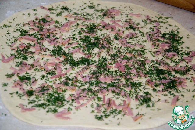 Смазать оливковым маслом или взбитым белком. Смешать укроп и чеснок. Посыпать на тесто. Далее ветчину.