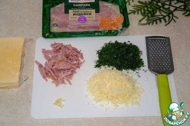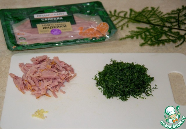 Подготовить начинку. Ветчину нарезать мелкими полосками. Чеснок через пресс. Укроп мелко порезать.