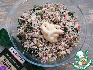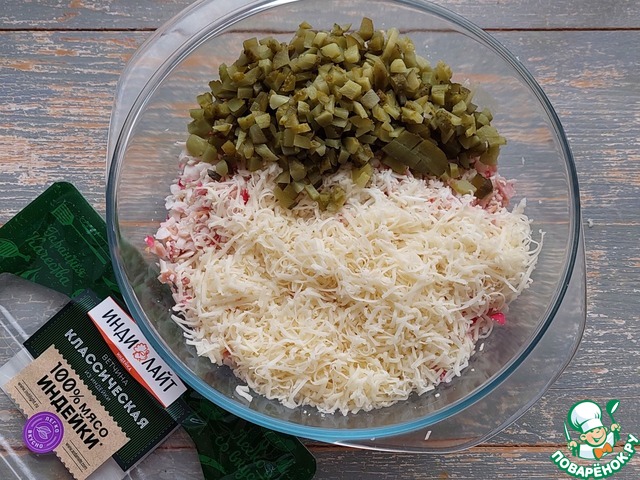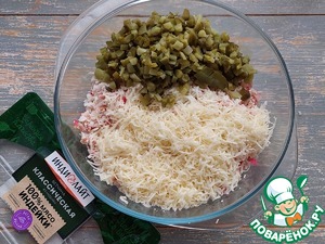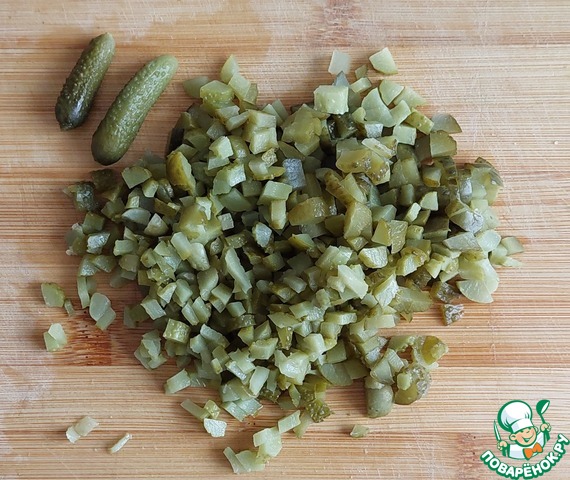 Сыр и корнишоны добавить к остальным ингредиентам.
