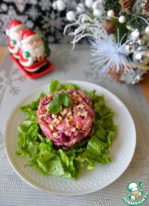 При подаче салат слегка утрамбовываем, убираем кольцо. Посыпаем салат дробленым грецким орехом, зеленью. Приятного аппетита!