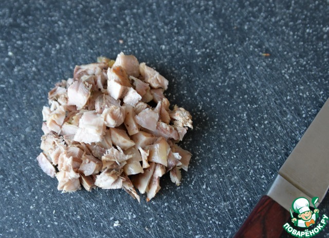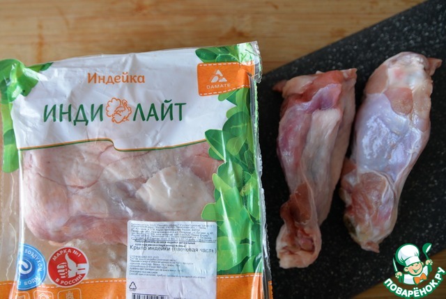 Берём любую часть индейки по наличию. Можно, конечно, брать филе, я выбрала крыло индейки (плечевую часть) "Индилайт". Индейку моем, заливаем водой, солим, доводим до кипения, варим около 40 минут на среднем огне. Даём остыть.