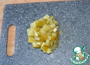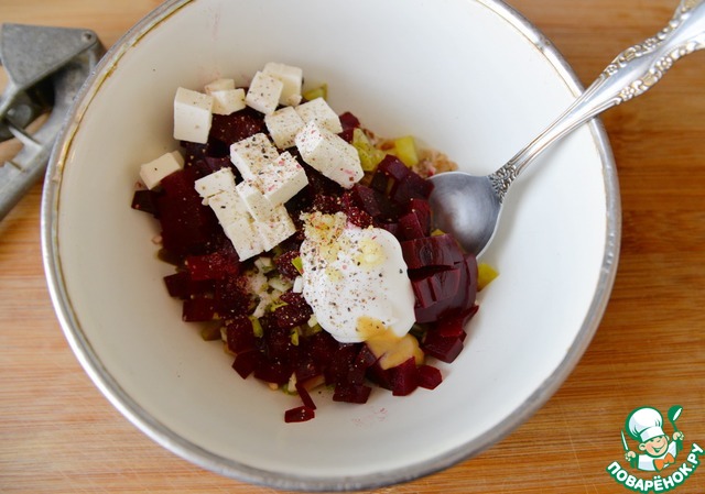 Соединяем все ингредиенты. Для заправки смешиваем сметану, творожный сыр, горчицу, соль, перец, выдавливаем чеснок. У меня творожный сыр для салата, поэтому его порезала кубиками. Аккуратно перемешиваем.