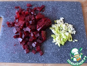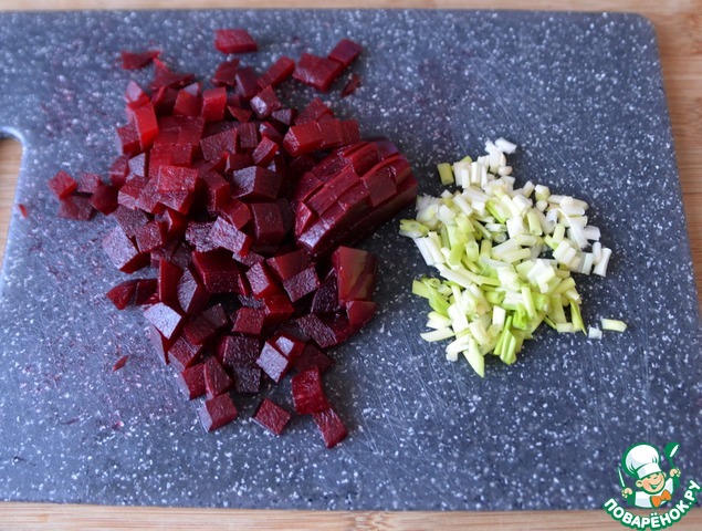 Вареную свеклу чистим, режем кубиками. Зелёный лук колечками.