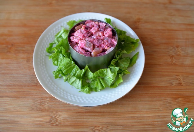 Кладём салат на листья салата. Я делала порционную подачу. На тарелку ставим сервировочное кольцо, вокруг кладём порезанные листья салата. В кольцо кладём салат.
