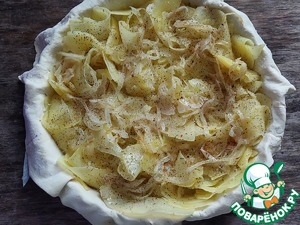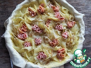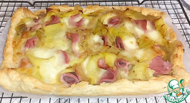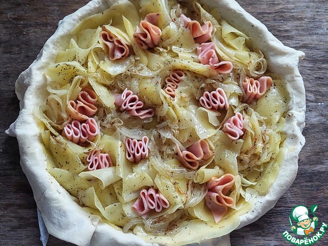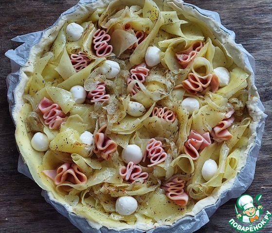 Представляю вашему вниманию очень вкусный пирог, где все ингредиенты замечательно сочетаются друг с другом: слоеное тесто с начинкой из картофеля, жареного лука, ломтиков ветчины и шариков моцареллы. Угощайтесь!