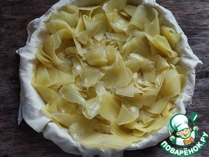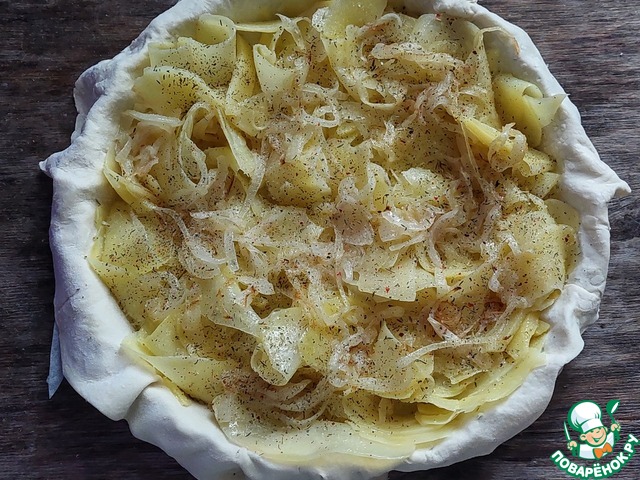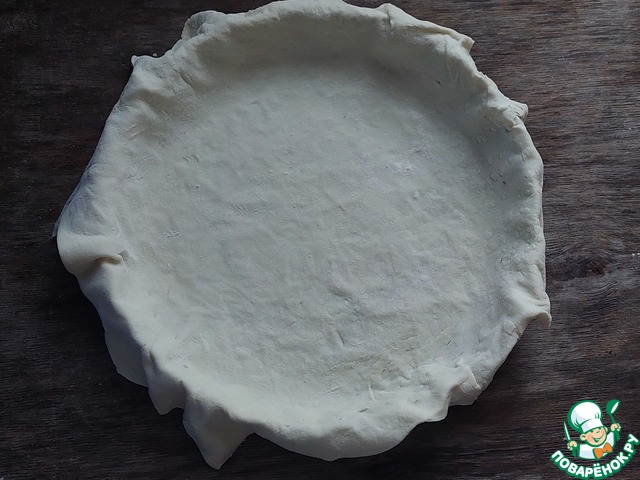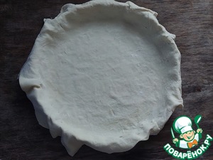 Форму для выпечки застелить пергаментом, смазать растительным маслом. Слоёное тесто заранее разморозить, раскатать нужного диаметра (у меня 30 см.). Распределить тесто в форме, формируя бортики.