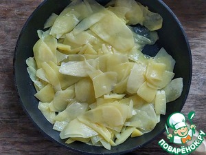 Картофель обжаривать на разогретой сковороде в растительном масле (2 ст. л.), непрерывно помешивая 2 мин., для того чтобы каждый картофельный слайс пропитался горячим маслом.
