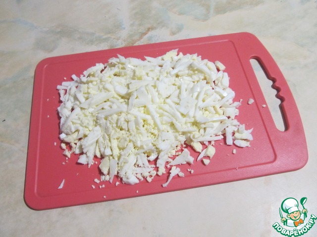 Яйца очистить и нарезать соломкой или натереть на крупной терке.