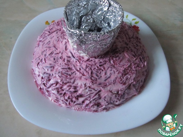 Для формирования салата в форме браслета стакан или баночку обернуть фольгой и поставить в центр блюда. Вокруг выкладывать салат слоями.