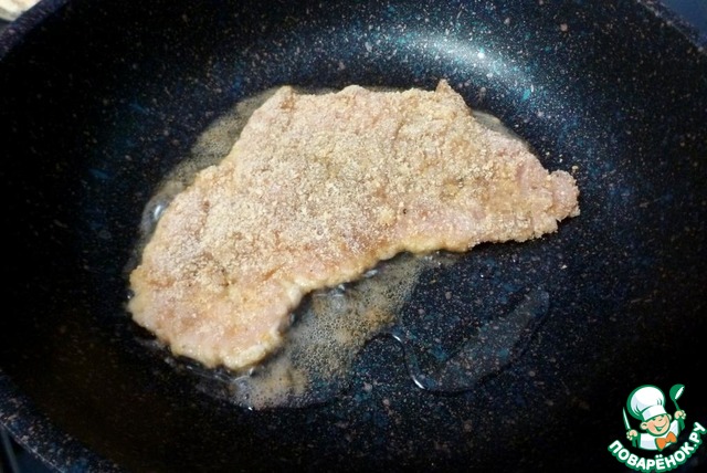 Обмакнуть отбивную в яйцо, а потом в сухари. По правилам полагается эту процедуру повторить еще раз. Но зачем нам двойной слой панировочных сухарей? ))