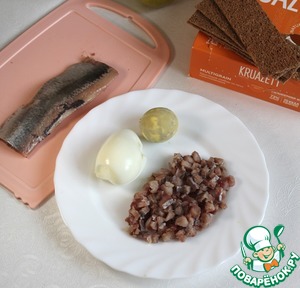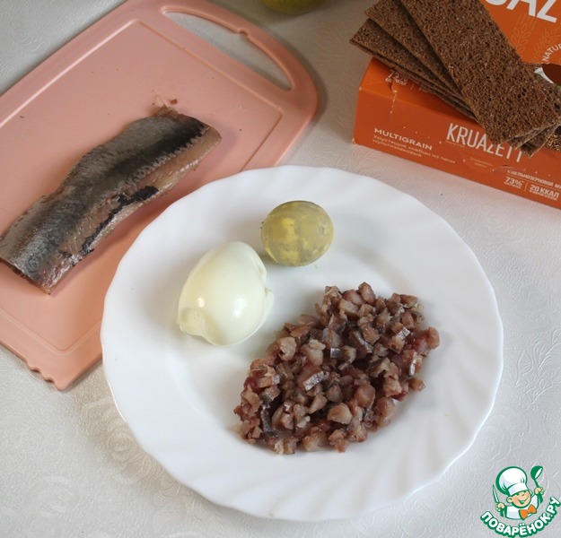 Приготовьте ингредиенты. Яйцо отварите, слабосоленую сельдь почистите, отделите филе.