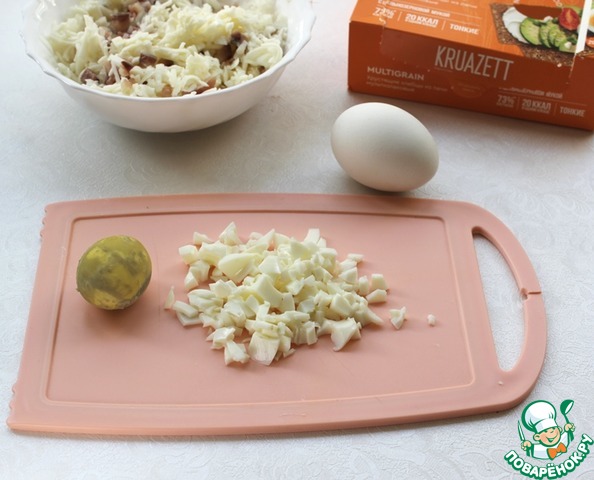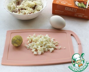Очистите вареное яйцо, один желток отложите. Сельдь мелко нарежьте.
