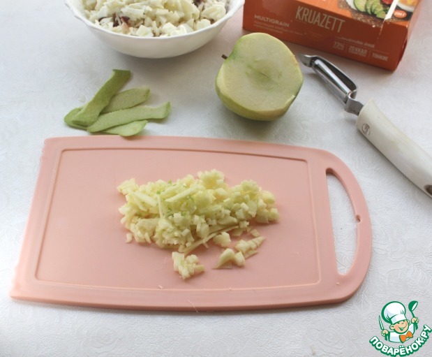 Яблоко очистите и нарежьте мелкими кубиками. Если яблоко сладкое, желательно сбрызнуть его лимонным соком.