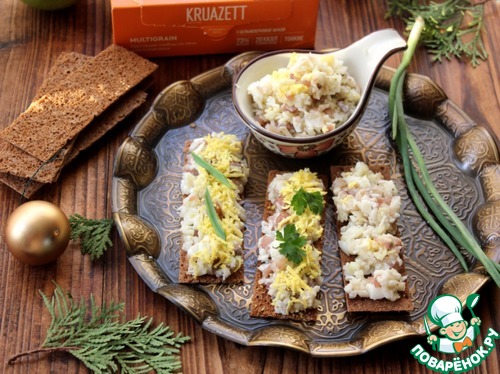 В этой закуске органично переплетаются сочный и с легкой кислинкой вкус яблока, нежность слабосоленой сельди, бархатистость сыра и хрустящие хлебцы Kruazett. Подайте к столу эту закуску и ваши гости по достоинству её оценят!