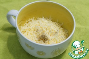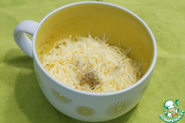 Сыр натереть на мелкой тёрке, поперчить, добавить майонез и чеснок через пресс. Перемешать.