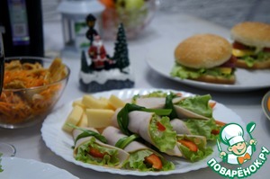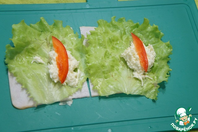 Положить листик салата, затем сырную начинку и полоску болгарского перца.