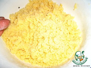 Теперь начинка: сахар, масло (уплотненное) и 3 стакана муки растираем руками до однородной массы и добавляем пакетик ванилина