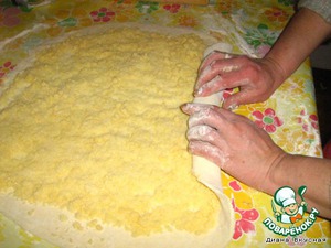 Затем опять раскатываем тесто и кладем равномерно вторую часть начинки